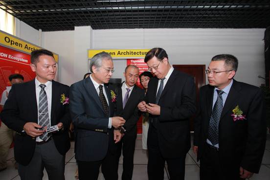 各界嘉賓參觀展區,日方代表石川千秋(左一)現場解說展區。高新區管委尚主任(左三),坂村健教授(右三)、東芝代表廣里暢盛先生(右一)現場參觀。