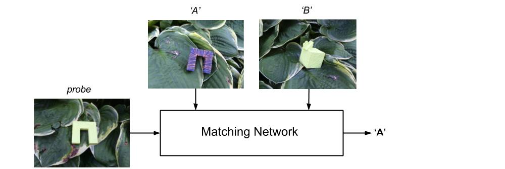 帶有匹配網絡(atching Networks)的認知心理學實驗示意圖。匹配網絡將左側的探測物體匹配到「A」圖或「B」圖。匹配網絡的輸出取決于其形狀偏好的強度。
