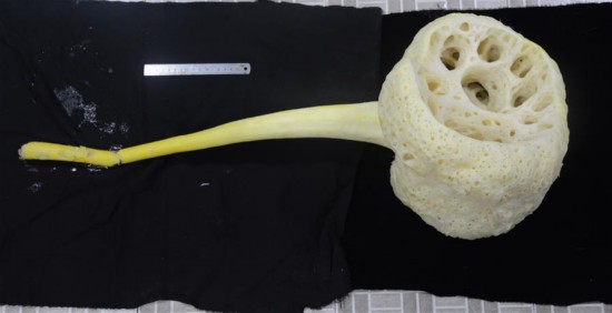 “發現”號采集到的偕老同穴海綿(8月14日攝)。 8月14日,中國新一代遠洋綜合科考船“科學”號搭載的“發現”號遙控無人潛水器在西太平洋下潛考察卡羅琳海山,采集到豐富生物樣品。新華社記者 張旭東 攝
