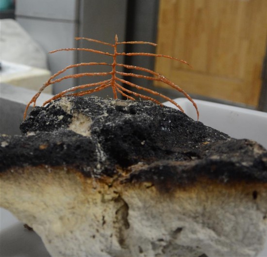 “發現”號采集到的一塊巖石上附著一株珊瑚(8月14日攝)。 8月14日,中國新一代遠洋綜合科考船“科學”號搭載的“發現”號遙控無人潛水器在西太平洋下潛考察卡羅琳海山,采集到豐富生物樣品。新華社記者 張旭東 攝