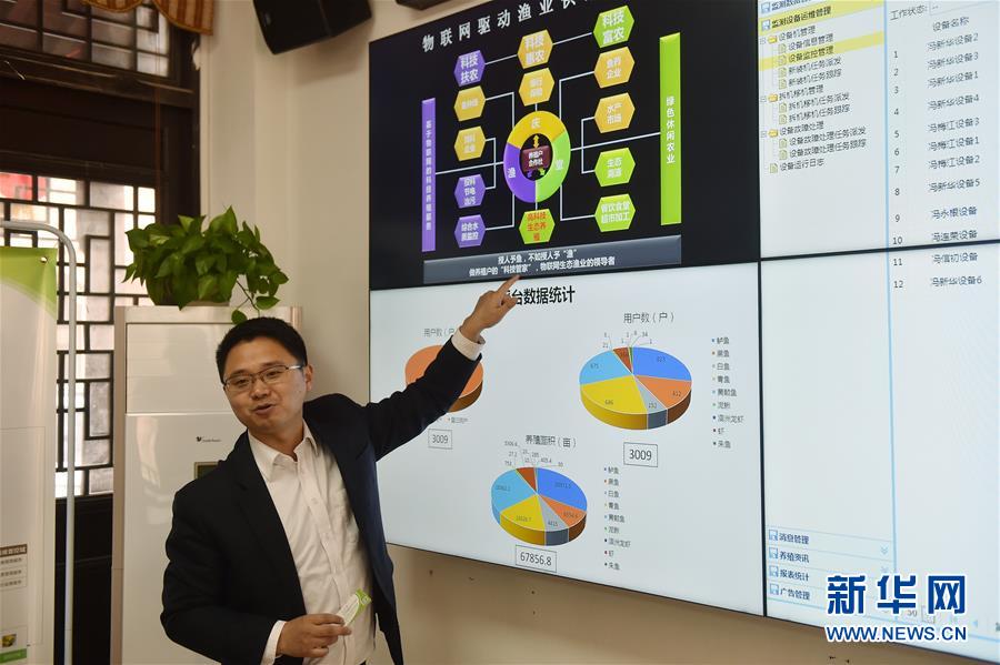 “博士漁夫”沈杰在浙江省湖州市菱湖鎮創辦的公司內介紹匯集養殖戶、飼料廠商、銷售檔口、金融機構等相關方的物聯網平臺(3月21日攝)。沈杰是目前國內物聯網領域專業人士,他搭建起匯集養殖戶、飼料廠商、銷售檔口、金融機構等相關方的物聯網平臺,正從養殖、銷售、融資等環節重構漁業生態。新華社記者 黃宗治 攝