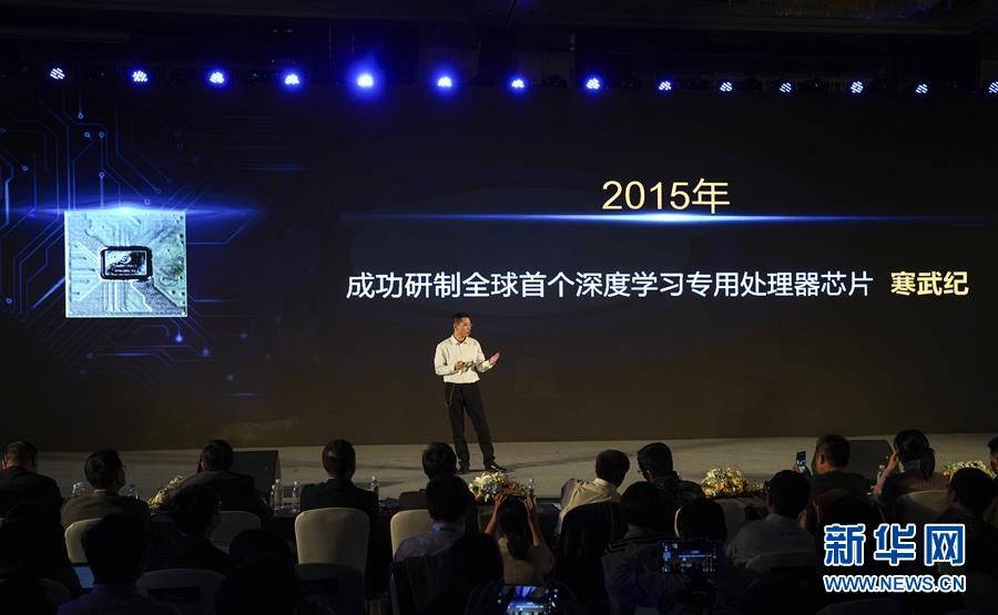 11月6日,中科院計算所研究員、寒武紀公司首席執行官陳天石在介紹寒武紀人工智能芯片。當日,中國科學院孵化的寒武紀科技公司發布新一代人工智能芯片,采用與“阿爾法狗”類似的深度學習技術,適用范圍覆蓋了圖像識別、安防監控、智能駕駛、無人機、語音識別、自然語言處理等人工智能的重點應用領域。此次發布會由中國科學院主辦,寒武紀科技公司承辦。新華社記者殷剛攝