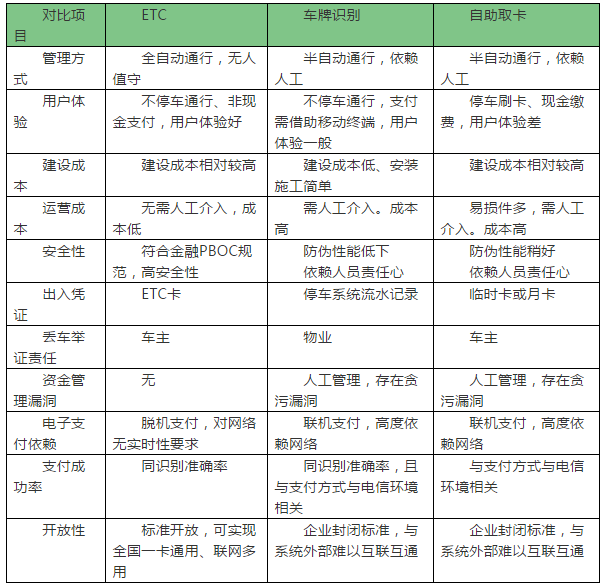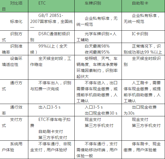 在國內停車場繳費領域,缺乏統一的停車支付類技術標準和運營體系。以車輛身份識別技術為核心特征,停車場系統方案可劃分為以下三種: ETC、車牌識別及自助取卡。相對于傳統的自助取卡方案,ETC與車牌識別做為智能停車場管理領域中的兩大主流技術,兩者的特征列舉如下: