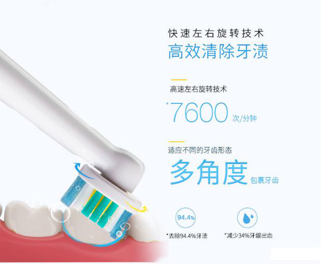 6、使用方便:大家在休息前或者早上起床時,都會沒有太多精神和力氣,因此不能保證刷牙的時間和刷牙動作的規范,對于牙齒的保健效果自然就大打折扣。電動牙刷可以很好地解決這個問題,自動旋轉的刷頭,符合人體工程學的整體設計,保證了刷牙的有效與便捷。使用起來這么方便,刷牙自然就很輕松了,也容易培養我們好的習慣。