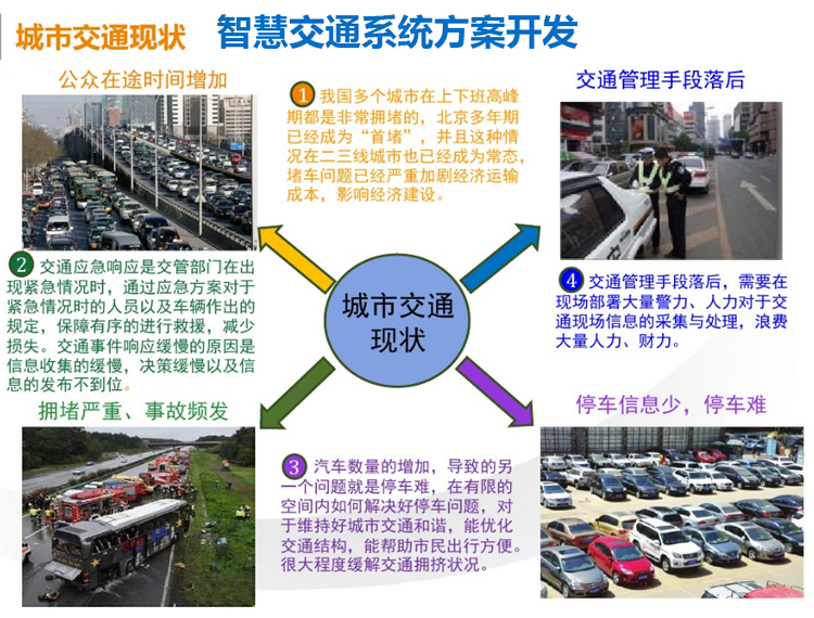 目前中國乃至整個世界面臨的嚴峻的城市交通的問題,在我國更是尤其可利用的空間較少,交通不通擁擠的現象更是時有發生。交通擁擠和事故帶來了經濟的巨大損失;加之城市土地資源和資金有限,不能單靠傳統修建道路的方法解決交通問題,因此要建立正確的智能交通系統圖管理城市的交通網,而不能靠傳統的方法進行。在此背景下,智能交通系統將發揮它獨特的作用,因此建立智能交通系統非常必要,大力解放勞動力資源,使他們能發揮更大的作用,提高工作效率,降低事故發生率。