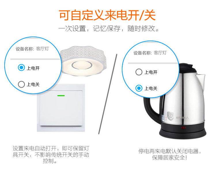 1、電源控制:可以遙控熱水器、加濕器、電暖氣、電扇、地燈用電器的開關,現代的電器大多數在“關閉”后,仍會消耗電能??梢栽诓恍枰褂眠@些電器的時候將它們真正關閉,既節省能源,又安全,而且還能延長電器壽命。