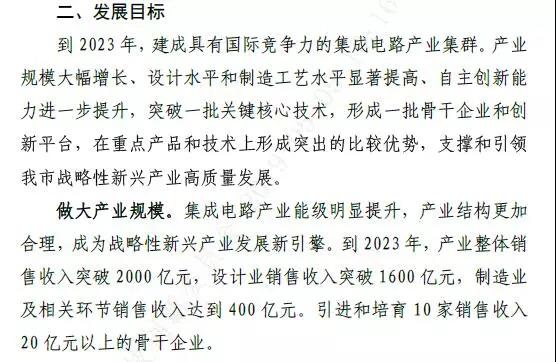 到2023年,產業整體銷售收入突破2000億元,設計業銷售收入突破1600億元,制造業及相關環節銷售收入達到400億元,引進和培育10家銷售收入20億元以上的骨干企業,成為戰略性新興產業發展新引擎。