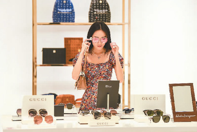 近日,海南三亞國際免稅城在海南三亞市增開了兩家免稅體驗店。顧客可在免稅體驗店內體驗商品后,在網上下單購買。圖為一名顧客在新開于三亞紅樹林度假酒店內的免稅體驗店體驗商品?! ∑褧孕駭z(新華社發)