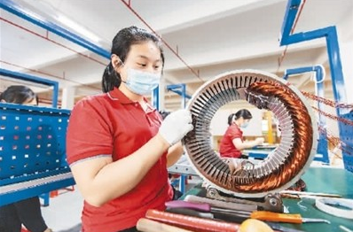 江西力好新能源科技股份有限公司作為一家新能源汽車生產高新技術企業,復工復產以來按下生產“加速鍵”,進入滿負荷生產狀態,全力打造當地第一家5G+工業互聯網示范工廠。圖為工人在該公司生產車間進行嵌線工序操作。羅建榮攝(人民視覺)
