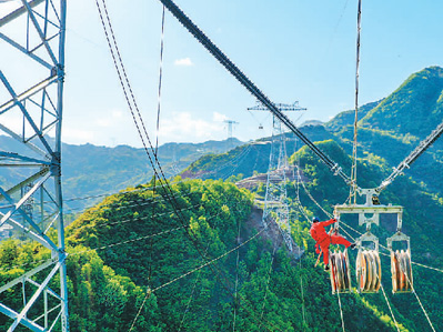 青?!幽稀?00千伏特高壓直流工程是首條專為清潔能源外送而建設的特高壓通道,可將青海的清潔能源直送華中負荷中心,滿足華中經濟發展及負荷增長需求。包含特高壓、高鐵、5G基建等領域在內的“新基建”項目可對拉動經濟產生積極作用。圖為電力建設者正在該工程陜南秦嶺段進行架線施工。祝赫攝(人民視覺)