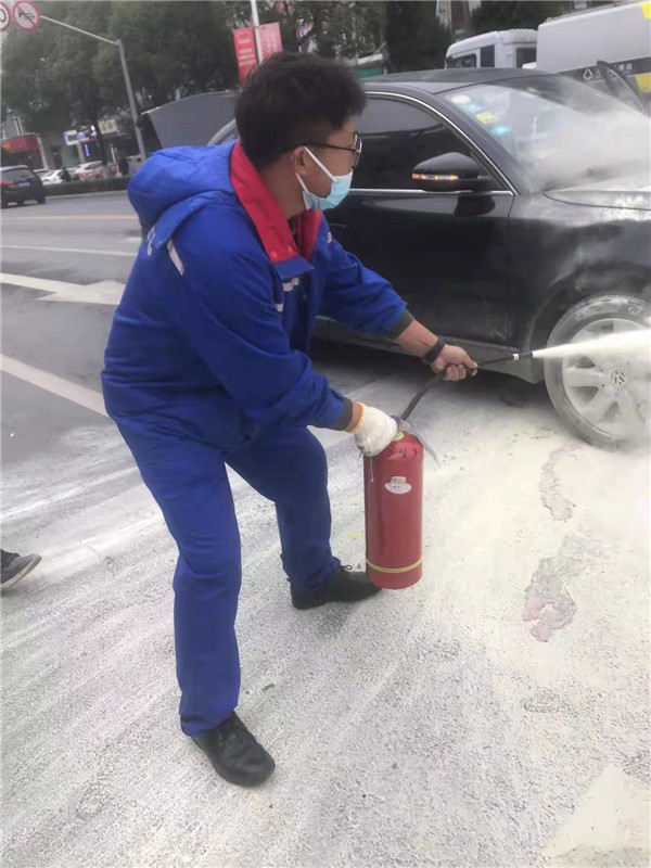 2分鐘后,吳濱等兩名員工用盡2支滅火器,終于將著火部位徹底撲滅。隨后,員工陪同驚魂未定的車主守候在車輛旁,防止車輛再次復燃,直至救援車將車輛拖離現場。