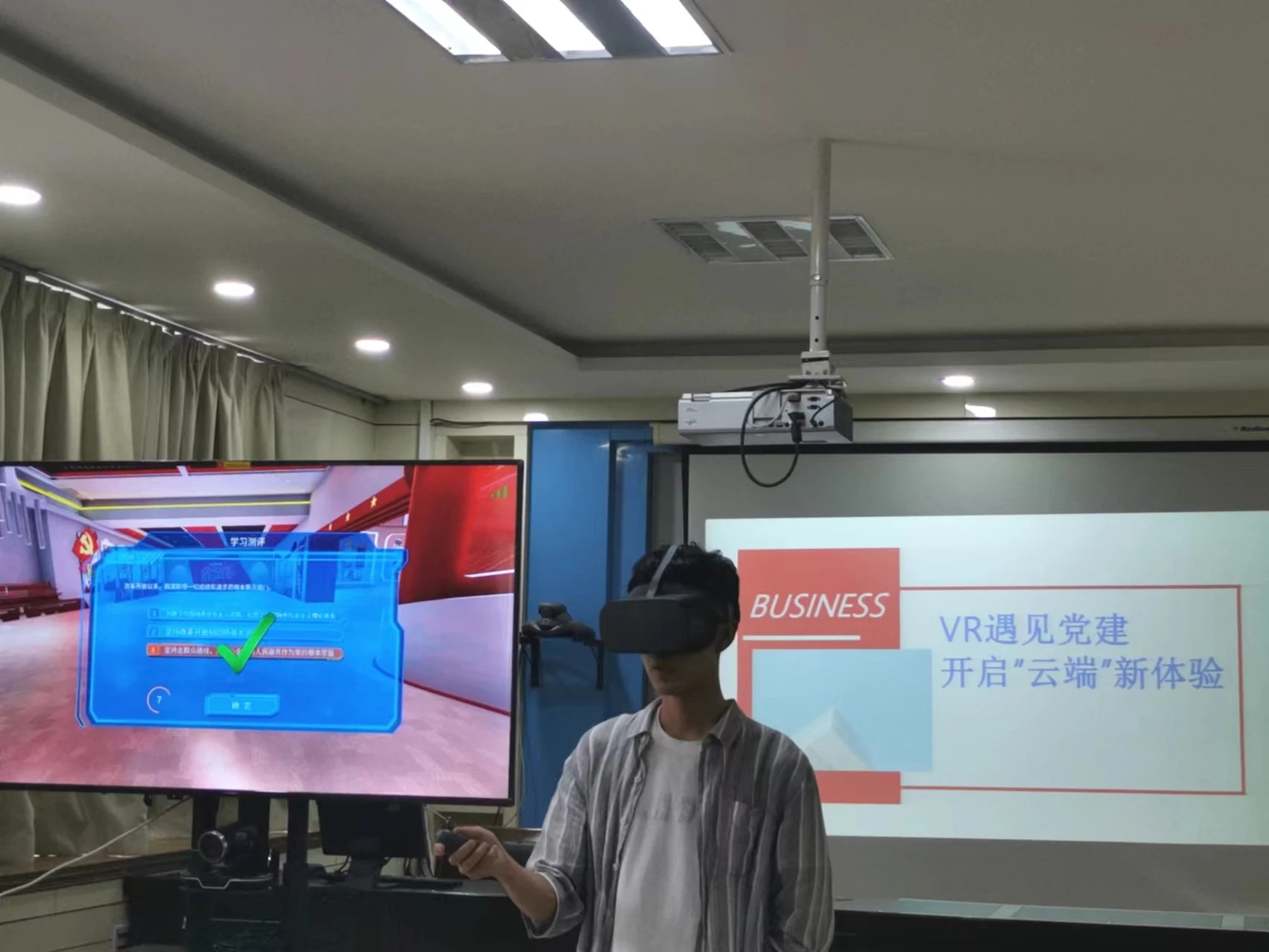 活動中,首先介紹了VR技術發展及應用概況,隨后,全體黨員依次佩戴VR頭盔、手持手柄控制器,進入到虛擬與現實之旅中。此VR虛擬展館展廳面積為10000平方米,內容涵蓋了偉大的開端、在民族抗戰的洪流中、最后的決戰……等11個主題,同時可在虛擬展館中觀看視頻、互動答題。虛幻的環境和逼真的感官刺激,既增加學習過程和實踐過程的趣味性,又達到學習和教育的目的。
