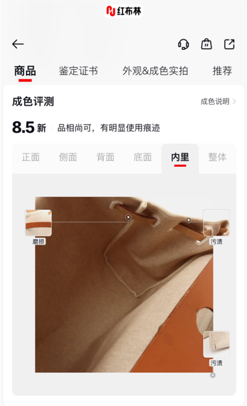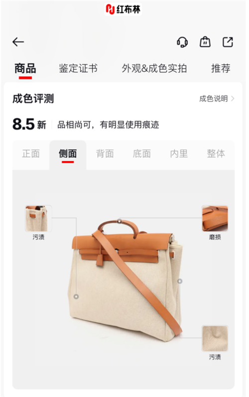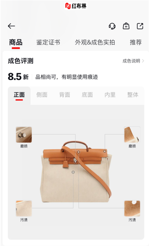 如何讓用戶更清晰、更透明的了解二手奢侈品的成色評測環節?紅布林在行業內首先給出了答案,即把成色評測模塊變成結構化,用戶可以通過結構化的展示,清晰了解到每個瑕疵點的情況,更加直觀地感知到9.9新、9.5新、9.0新、8.5新這些不同商品成色之間的區別,并且能清晰了解瑕疵所在的位置以及具體瑕疵情況。