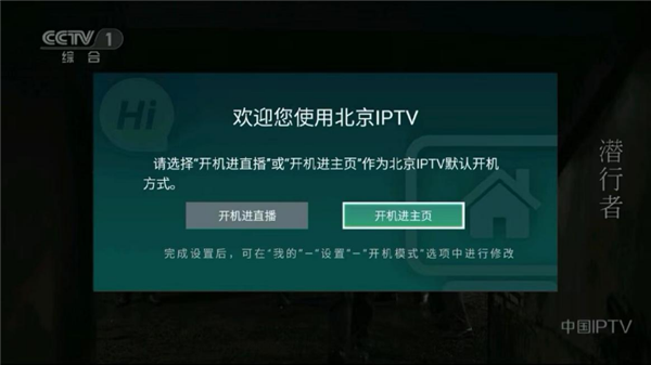 首次開機進入北京IPTV時將會直接進入到直播頻道,同時屏幕彈出“開機進直播”和“開機進主頁”的彈窗選項,您可根據自己的使用習慣進行選擇。