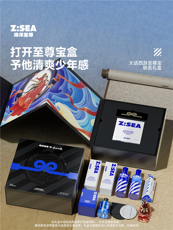 在本次的展會上,海洋至尊還帶來了他們最新的熱門產品--與《大話西游》聯名的至尊寶禮盒。據了解,這款產品是海洋至尊2023年的第一款IP聯名禮盒。除了準備了常規的男士護膚產品--藍藻潔面露、控油水、控油乳、補水面膜、男士香水,還特意打造了《大話西游》這一愛情經典IP的高顏值周邊--銅鏡、金箍發帶、至尊寶手辦,高價值紀念周邊+一整套男士護膚產品,給予用戶至尊護膚,至尊的愛。