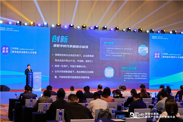 大會現場,工信部教育與考試中心副主任劉明亮作關于“數字經濟與數字人才發展”的主旨演講。浙江省工業和信息化研究院院長劉兵、南京靈境元宇宙研究院戰略合作總監湯海龍、寧波工程學院網絡安全學院院長鮑淑娣、上海道感科技公司總裁嚴崢、華為云計算公司AI首席架構師黎浩梁等行業專家分別發表了關于“數實融合”“AIGC賦能”“數字人才發展”等方面的主題演講。臺上嘉賓通過前沿的數字產業賦能主題分享,為在場部門和企業帶來先進的思想。