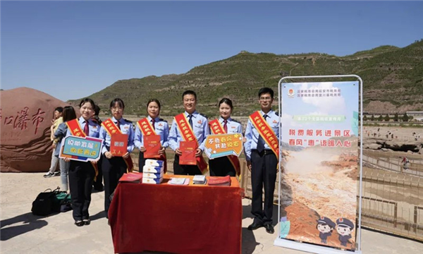 4月23日,在第33個全國稅收宣傳月期間,延安市稅務局、宜川縣稅務局兩級聯動,組織延安稅務張思德服務隊走進壺口瀑布景區,開展“稅惠到坊”—稅費服務進景區活動,為廣大游客和商戶送去最新的稅費優惠政策,讓稅費優惠的春風吹進萬家。