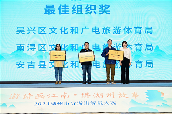 最終,綜合前期知識測試和網絡投票的成績,導游組徐佳穎和講解員組王兆成一路過關斬將,憑借出色的表現,勇奪各自組別的冠軍。吳興區文化和廣電旅游體育局、南潯區文化和廣電旅游體育局、安吉縣文化和廣電旅游體育局榮獲“最佳組織獎”,導游組徐佳穎、吳芳敏、羅婧怡和講解員組王兆成、付意、劉喻榮獲“湖州市技術能手”稱號。