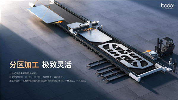 分段式床身設計帶來的超大幅面,讓不同加工區域可同時開展不同工序,實現邊切割、邊上料、邊下料。無間隙式的循環加工,既節省時間,還能實現高效精準加工。與此同時,各模塊化臺面還可分別切割不同厚度的板材,一體化加工的運作方式,為客戶省去停工換料的時間與人力成本。