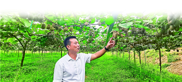 6月24日,信陽市浉河區十三里橋鄉學堂崗村黨支部書記葉調成在“支部聯支部”活動中謀劃的集體經濟產業項目果園里查看果子生長情況。(本報記者尹小劍攝 通訊員翁應峰)