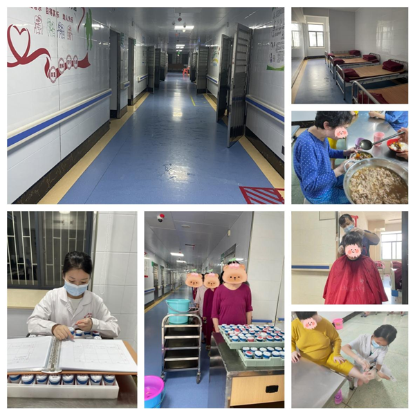 精神科的醫護不是大家想象中的暴力鐵漢,而是既要負責患者醫療護理、也要照顧患者生活起居的貼心小衛士。由于封閉病區患者無家屬陪護,對患者病情的觀察以及日常生活照料成為了醫護人員義不容辭的責任,每天的工作除了常規的診療外,也要兼顧心理護理、督促服藥、喂飯、協助洗澡、修剪指甲、洗漱等等。我們有一位患者,在多年前因攻擊性強在家長期被鐵鏈鎖住導致雙足血運壞死而截肢,由于社會功能缺失,完全沒有自我照料能力,加上營養不足,當時的她身體消瘦如柴。入院后,我們醫護人員根據她的癥狀與身體狀態制定了相應的治療和護理方案,除了按時喂飯、定時給藥,醫生每天會和她進行言語交流促進患者語言表達和社會功能恢復,也會觀察她截肢部位的情況,預防傷口再次感染;護理人員幫助她刷牙、洗澡、大小便,每天早上和午睡醒來,貼心的護工阿姨會將患者從床上抱到輪椅上,推著她進行適當活動,剛開始,我們只需要一名工作人員可以抱動她,住院一段時間后由于體重上升,增加到兩名工作人員才能抱動?;颊邚膭側朐簳r對醫務人員保持警惕和攻擊狀態到慢慢放松戒備、主動配合治療,如今的她,精神癥狀與精神面貌與入院前判若兩人。