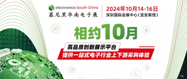 慕尼黑華南電子展(electronica South China)將于2024年10月14-16日在深圳國際會展中心(寶安新館)舉辦。本屆將聚焦電動車、車規芯片、物聯網、AI芯片與智能終端、消費電子、藍牙技術,儲能、三代半、集成電路、傳感器、連接器、無源器件、電源與測試測量、PCB等熱門電子技術與應用,通過主題展區和技術論壇,從前沿技術到實際應用,為專業觀眾提供電子領域一站式采購平臺。