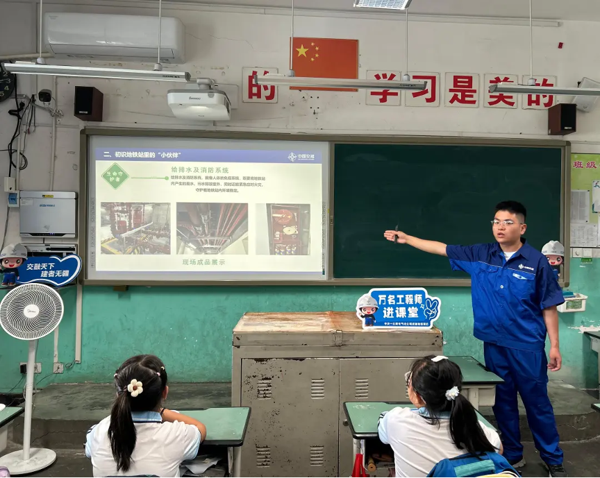 專業引領,開啟機電知識之旅。成都地鐵項目機電工程師李佳泳登上講臺,化身科普講師。他針對小學生的認知特點,以生動有趣、通俗易懂的方式,詳細講解了地鐵機電安裝中的三大核心系統——通風與空調系統、給排水及消防系統、動力與照明系統。結合成都地鐵建設中的實際案例,向同學們介紹了這些系統如何保障地鐵安全、舒適運行。在講解通風與空調系統時,工程師通過展示地鐵車站內巨大的通風管道模型,解釋了如何為地下空間輸送新鮮空氣、調節溫度,讓同學們直觀感受到其重要性。同學們全神貫注,眼神中充滿好奇,不時踴躍舉手提問,“地鐵里的空調會不會像家里一樣滴水?”“消防系統是怎么知道哪里著火的?”現場互動氛圍熱烈,孩子們對地鐵機電知識的渴望展露無遺。