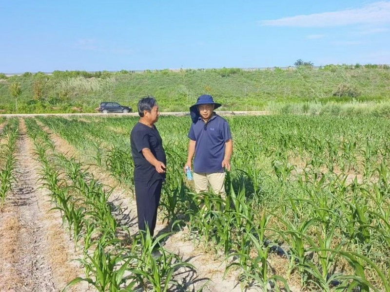 河北省農林科學院濱海農業研究所研究員薛志忠與河北龍馬寶稼肥業有限公司負責人李印堂一起查看曹妃甸試驗基地玉米長勢情況