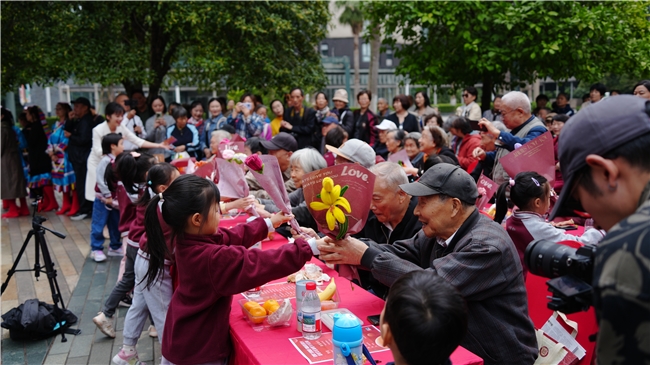 尤為暖心的是,錢塘實驗幼兒園的小朋友們帶來了萌趣十足的表演,天真爛漫的模樣瞬間點燃現場氛圍。表演結束后,孩子們手持親手制作的手工花,捧著香甜軟糯的重陽糕,逐一送到在場老人手中,稚嫩的聲音說著“爺爺奶奶重陽節快樂”,這份純粹的心意讓整個廣場暖意融融,也讓尊老愛老的種子在孩子們心中生根發芽。