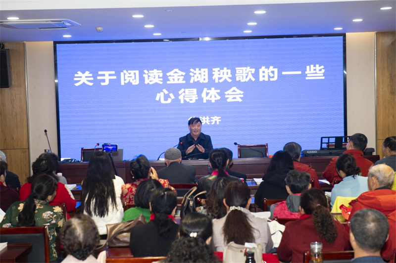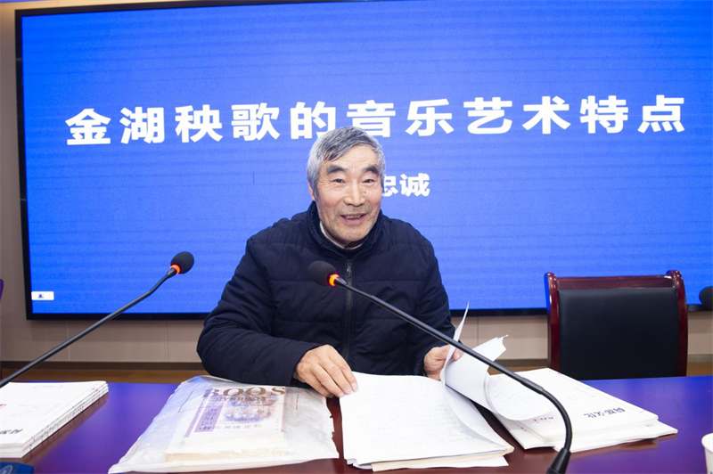 首日上午,培訓班特邀華洪齊、陳劍峰、房忠誠三位本土文化研究學者分別圍繞《關于閱讀金湖秧歌的一些心得體會》《金湖秧歌雜談》《金湖秧歌的音樂藝術特點》作了專題講授,從文化理解、歷史脈絡與音樂藝術等多個維度開展教學。隨后的培訓以實踐教學為主軸。13日下午及14日上午,由黃德玉老師擔綱主講,系統開展了金湖秧歌經典曲目的教唱教學,并組織非遺傳承人現場施教,幫助學員從理論走向實踐,從聆聽走向演唱。