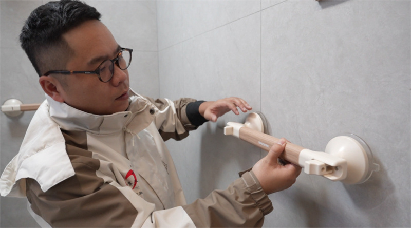 “在前期入戶評估時,我們把老人家里的布局、老人的行動能力和生活習慣都摸得透透的?!备脑旆桨竿耆N合老人的生活需求,如考慮到房屋剛裝修,家屬不想留下改造痕跡,團隊定制了吸盤式墻面扶手和床邊落地扶手,無需打孔就能穩固安裝在臥室、客廳和衛生間,既不破壞裝修,又能助力老人輕松起身;了解到老人外出依賴單拐、步伐緩慢,專門配置了可坐式助行器,讓老人出行時能隨時休息;還細心地給家具凸起部位做了包角軟包,避免老人磕碰受傷,并配備隨身呼叫器,方便照護人員及時響應需求。