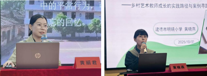 在實踐案例分享環節,明鏡小學黃麗君老師以《做幸福的鄉村藝術教育追光者》為題,分享了她在課程開發、團隊建設與學生美育浸潤方面的探索歷程,重點闡述了“以鄉土為材、以學生為鏡、以團隊為基”的三維育人策略。黃曉燕老師則圍繞《扎根鄉土,向陽生長》提出了“夯實根基——自主創新——團隊共建”的鄉村教師成長三階路徑,為現場教師提供了可借鑒、可落地的實踐范本。