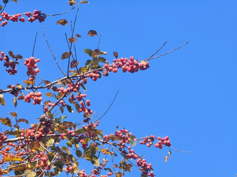作為薔薇科蘋果屬植物,海棠果在冬季可是“顏值擔當”。秋日,果實還帶著青澀,像藏在綠葉間的綠寶石;進入冬日,便悄悄染上胭脂紅,從淺粉到深紅層層遞進,直徑 2-3厘米的果子飽滿圓潤,果皮裹著一層薄薄的果粉,陽光一照,透著溫柔的光澤。目前,海棠果正處于“成熟期”,伴著零星飄落的海棠葉,紅果配黃葉,隨手拍都是冬日氛圍感大片!