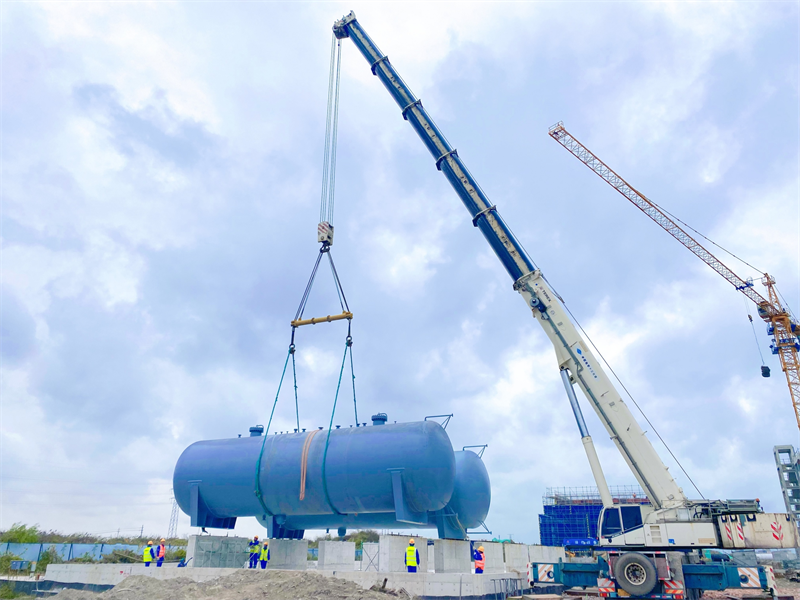 液氨罐組裝置共6臺儲罐,本次吊裝的2臺液氨儲罐直徑4.2米,長度15.278米,單臺凈重57.975噸。正式吊裝前,項目團隊先進行了設備方位轉正?,F場指揮人員精準調度,采用350噸起重機與85噸履帶起重機,將臥罐平穩轉正方位,為順利吊裝做好充足準備。吊裝過程中,全體施工人員密切配合,嚴控吊裝作業范圍,積極克服施工場地狹小等困難,用時4小時,順利完成首吊工作。
