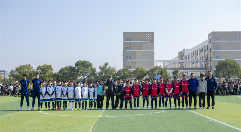 伴隨著鏗鏘鼓點,國旗方陣、校旗方陣、班主任方陣、校足球隊方陣及各年級學生方陣依次入場,步伐整齊劃一,精神昂揚抖擻,充分展現港城實小師生團結向上、銳意進取的良好風貌。學校分管德育工作副校長陳治宇致辭時,闡釋足球運動對助力學生全面發展、豐富校園文化的重要意義,向支持活動的各方力量致謝;南通支云足球俱樂部蘇超聯賽球員代表陳正寄語學校足球事業蓬勃發展,并與隊友共同捐贈簽名足球、球衣,傳遞足球運動正能量。裁判員代表、足球運動員代表先后宣誓,承諾堅守公平公正原則、恪守體育精神,護航活動有序開展。宣誓完畢,南通支云足球俱樂部明星球員與校足球隊隊員同場競技,攻防轉換間亮點頻現,場下師生助威聲此起彼伏,盡顯足球運動獨特魅力。