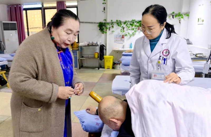 在醫院的針灸推拿康復科,張紅霞教授不僅分享了蒙醫藥在治療心腦血管疾病、消化系統疾病等方面的“三根平衡”理論與寒熱辨證,更深入病區,為腰椎病患者施治。她采用蒙醫傳統拔罐技術作用于百會穴與委中穴,配合腕踝針、頭針及手部腰痛穴的精準刺激,這一套融合了蒙醫特色與傳統中醫經絡理論的組合療法,讓在場的醫護人員眼前一亮。