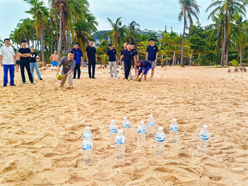 周末清晨,海風帶著淡淡的咸濕氣息輕拂而來,潮水正緩緩退去,將一片遼闊的沙灘與礁石灘展露在眾人眼前。礁石的縫隙間、濕潤的沙粒下,藏匿著無數鮮活的小生命,這些窸窸窣窣的動靜,勾勒出大海的生機與活力。經驗豐富的老員工代東生眼睛一亮,拍著手提議道:“咱們就地取材玩個團建游戲吧!用掉落的椰子當保齡球,礦泉水瓶做球瓶,既有趣又能熱熱身!”這個新奇的想法瞬間點燃了大家的興致,眾人紛紛圍攏過來,你一言我一語地討論規則:“得找平坦點的地方,不然椰子滾歪了不算數?!薄懊拷M派三個人輪流擊球,擊倒數量多的贏?!薄拜數慕M一會兒趕海得多幫贏的組撿兩個海鮮!”