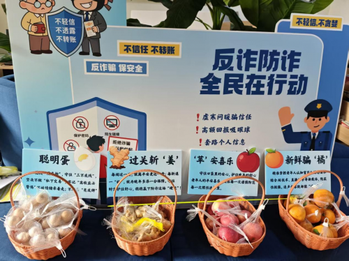第二個環節是守護美好“菜”籃子互動,為增強活動的趣味性和參與感,現場特別設置了“守護美好‘菜’籃子”互動游戲。老年人從一個象征“裝滿套路”的詐騙菜籃中,20秒內釣起寫有不同話術的袋子。參與者需要成功分辨并釣出“詐騙話術”與“正確應對策略”的組合。例如,釣起寫有“不輕易點擊陌生鏈接”、“不向陌生賬戶轉賬”等防詐要點的袋子,即可獲得對應的趣味果蔬一份。此環節不僅活躍了現場氣氛,更在輕松愉快的互動中有效鞏固了老年居民所學的防詐騙知識,提升了他們的實際辨別和應對能力。