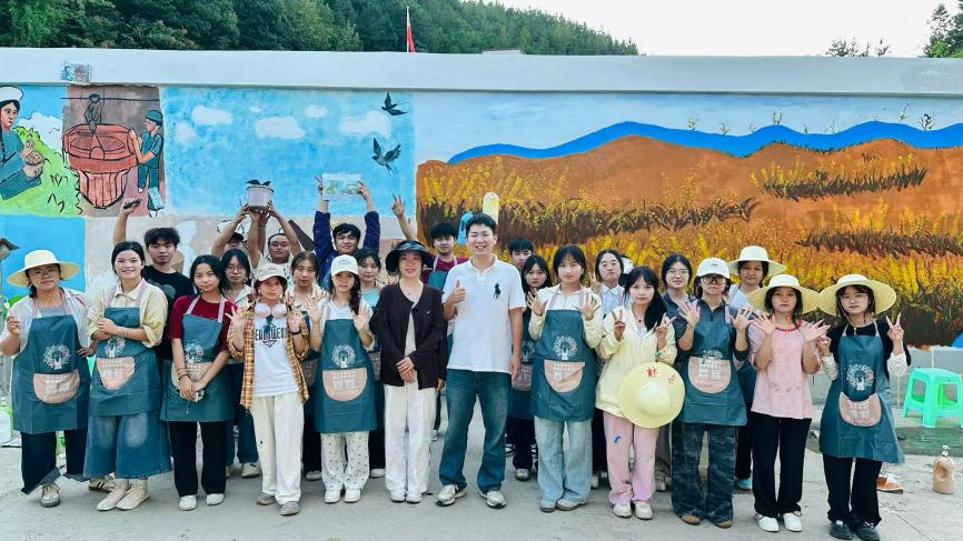 (圖為藝術學院師生開展“筑夢鄉村振興”公益墻繪活動)